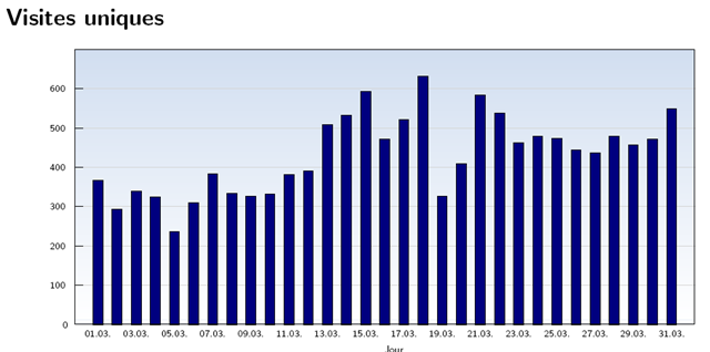 Une chose est maintenant sûre, c’est bien lorsque j’écris que j’ai des visiteurs (quelle lapalissade mes enfants !). L’évolution est notable depuis février, où j’étais apparemment à moins de 300 visiteurs uniques par jour, alors que je termine le mois de mars sur un trend de 450 vu/j. Chouette chouette chouette.